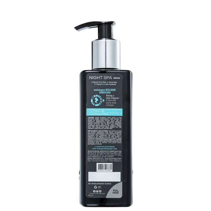 Night Spa Serum TRUSS é um Sérum capilar Noturno que promove hidratação para o cabelo. É ideal para todos os tipos de cabelos. Assegura fios hidratados e reconstruídos, livres de frizz e totalmente macios. Promove um brilho intenso, ao mesmo tempo em que sela a cutícula capilar e protege os fios dos danos diários.